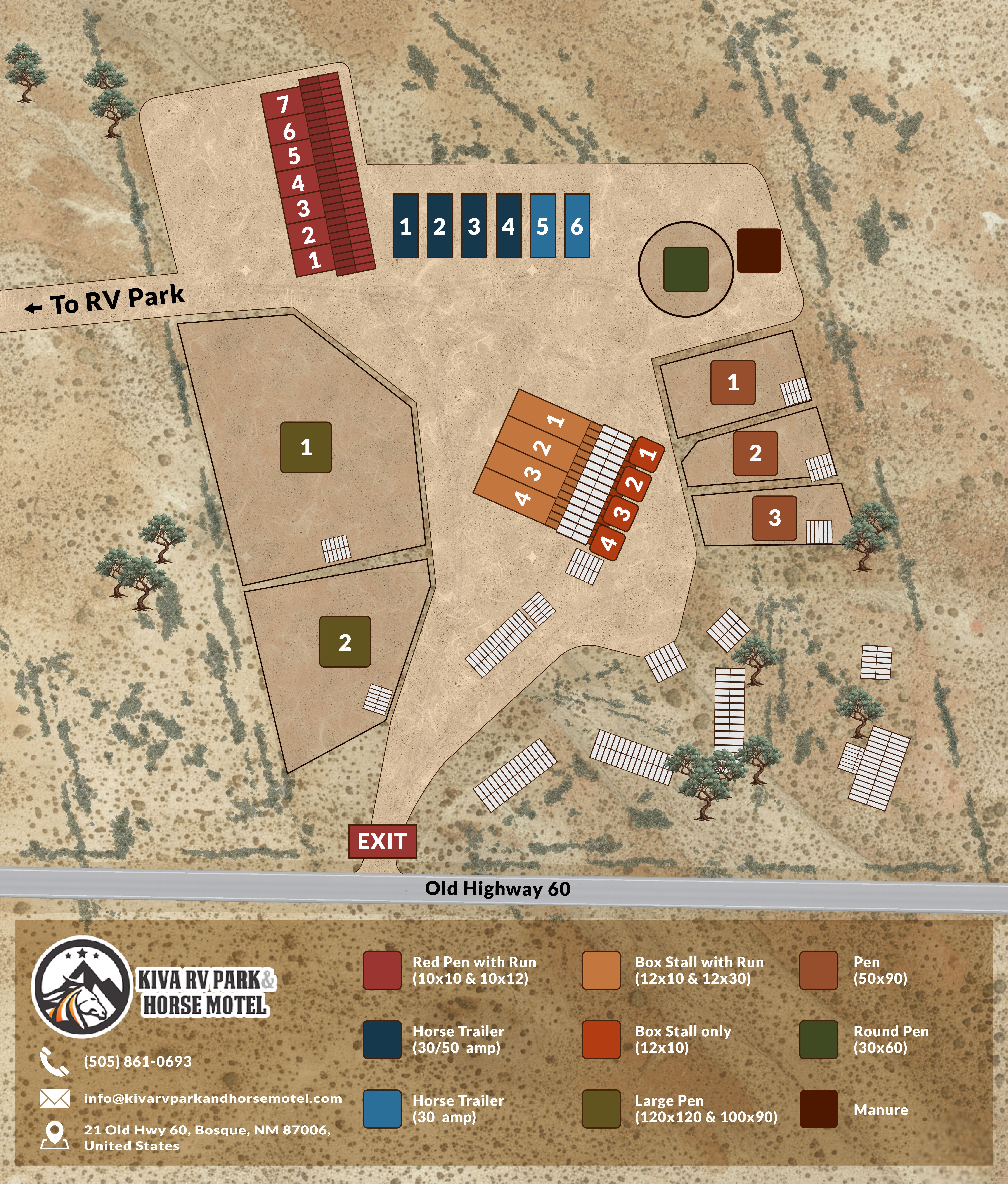 View the Horse Motel layout, including covered stalls, corral areas, water points, and the riding arena. Designed for easy access between the RV Park and barn area, this map helps riders find everything they need for a comfortable and organized stay.